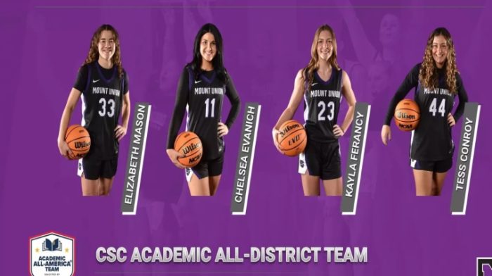 Mount Union juniors Elizabeth Mason (Alliance / Marlington) and Tess Conroy (Valley View / Cuyahoga Heights) along with sophomores Chelsea Evanich (Alliance / Marlington) and Kayla Ferancy (Amherst / Amherst Steele) have been named to the 2025-26 College Sports Communicators Academic All-District Women's Basketball Team.